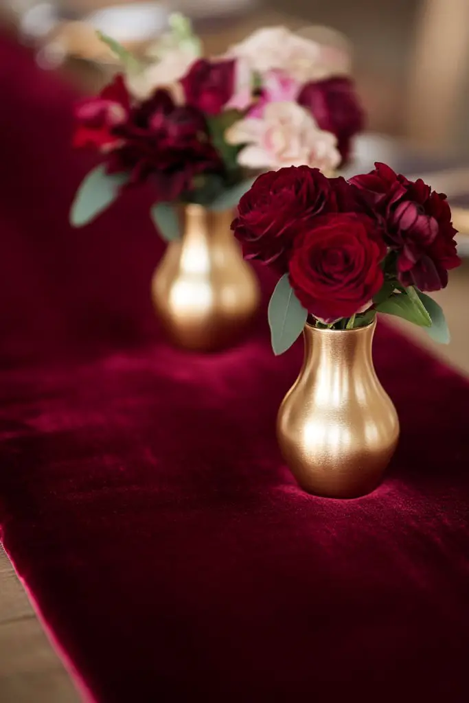 2. Burgundy Velvet Table Runner with Gold Accented Vases