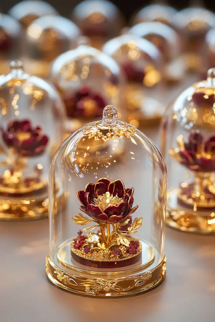 Looking for a display that’s both delicate and captivating? Glass domes with gold embellishments housing miniature floral scenes create a museum-quality effect. They add a sense of wonder and sophistication to your decor. If you love intricate details and a touch of whimsy, this idea will enchant your guests.