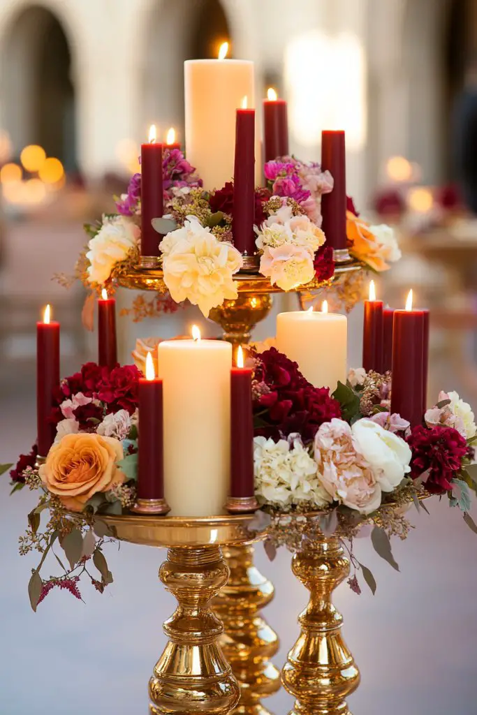 Want a centerpiece that’s grand, layered, and full of warm glow? A tiered array of candles in gold and burgundy paired with layered floral accents creates a stunning focal point. It’s perfect for formal events or celebrations that demand a touch of opulence. If you love dramatic, layered decor, this idea will elevate your table.
