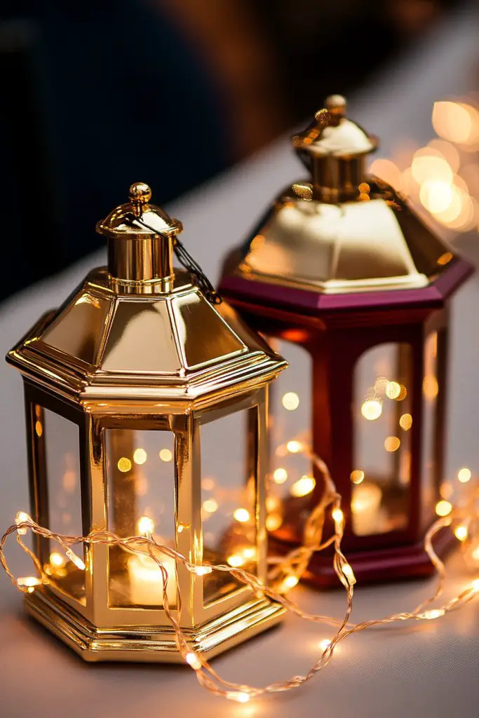 Picture a cluster of lanterns in varying sizes, their metallic surfaces reflecting flickering fairy lights. The gold lanterns catch the warm glow, while burgundy ones add depth and richness. Twinkling fairy lights weave in and out, casting a gentle shimmer over the entire display. The combination of metallic sheen and soft lighting creates a layered, textured visual that feels both festive and intimate.