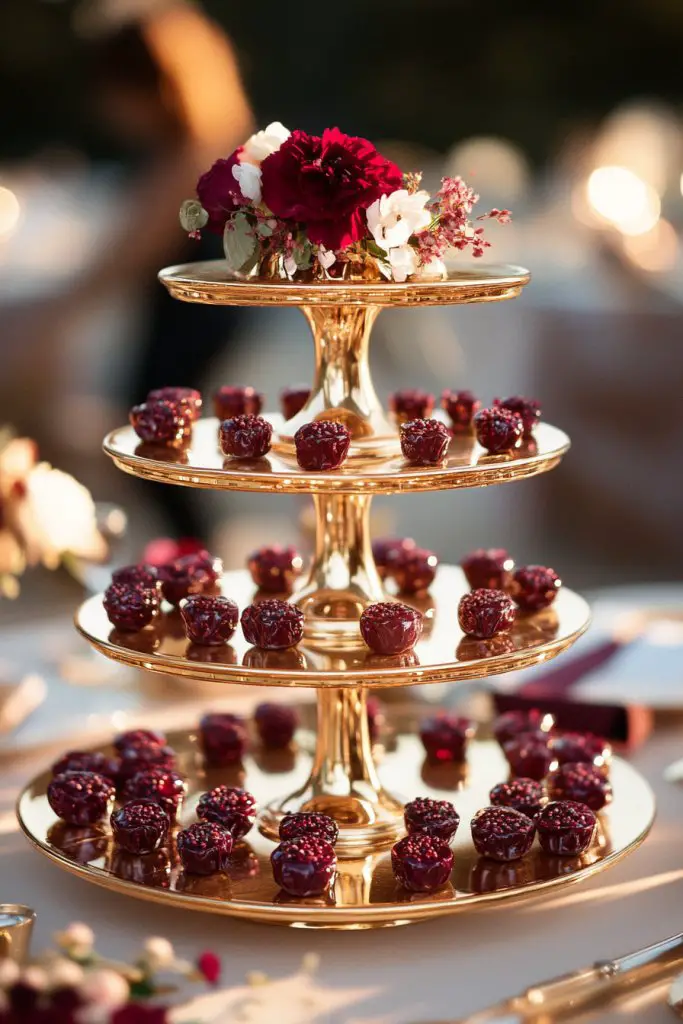 4. Gold Tiered Serving Stand with Burgundy Candies and Floral Accents
