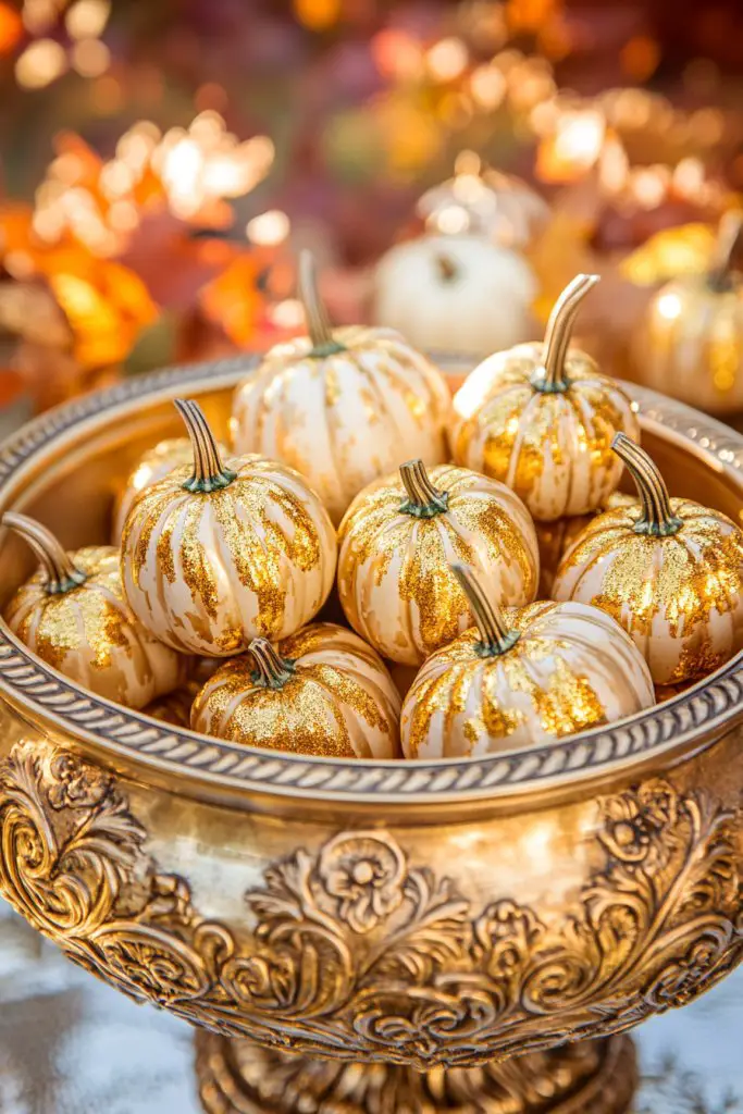 This centerpiece marries seasonal tradition with a touch of luxury, elevating any autumn or holiday gathering. It’s simple yet striking, making your table the highlight of the event. Guests will admire your attention to detail and creative flair. Ready to add a regal autumnal touch? Just gather your pumpkins, bowl, and a bit of gold leaf—done!