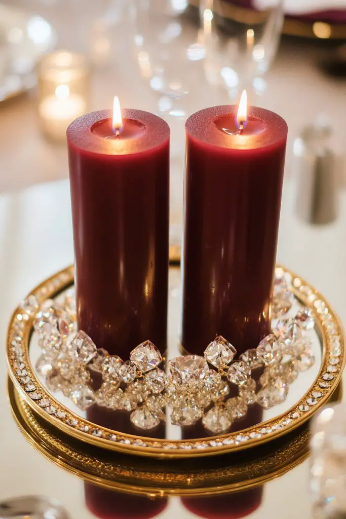 Choose a large, sturdy mirror tray with a gold finish. Place tall burgundy pillar candles at regular intervals, ensuring they are stable and secure. Scatter crystal accents or faux gems across the tray, filling gaps to prevent clutter. Light the candles just before your event starts, and keep the tray clean and dust-free for maximum shine. For added elegance, place the tray on a tablecloth with subtle shimmer or satin fabric. Use a small decorative clip or holder to keep candles upright.
