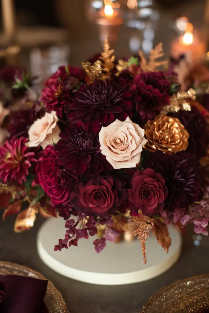 Craving a centerpiece that combines lush blooms with a touch of luxury? A floral arrangement on a foam base allows for endless creativity. Use deep burgundy and gold tones to evoke sophistication and richness. If you want a vibrant yet elegant display, this idea is worth trying.
