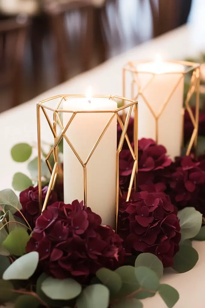 Picture a set of gold geometric frames, each holding a pillar candle in deep burgundy. Surround them with lush clusters of burgundy hydrangeas, their soft petals contrasting with the sharp angles of the holders. Eucalyptus sprigs weave through the arrangement, adding a silvery-green touch. The mix of metallic, floral, and foliage textures creates a balanced, eye-catching display. The combination feels both trendy and timeless, perfect for modern weddings or chic dinner parties.