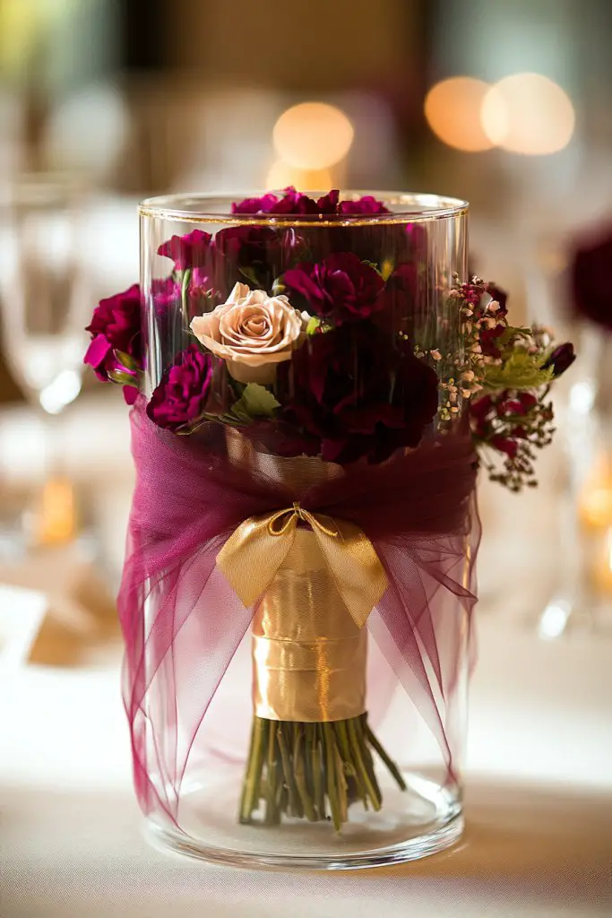Want a centerpiece that looks soft, romantic, and effortlessly elegant? Wrapping a clear vase or cylinder with burgundy tulle and gold ribbon instantly elevates simple fresh flowers. It’s a subtle way to add texture and color, perfect for weddings or intimate dinners. If you love delicate, handcrafted touches, this idea will inspire you.
