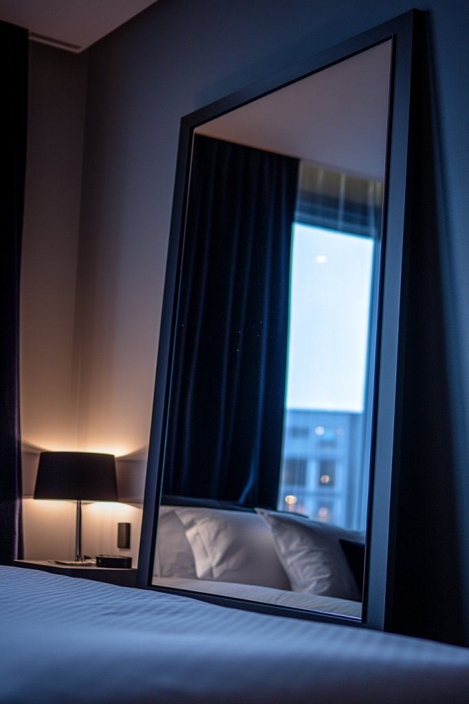 Imagine a bold, matte black mirror with a wide frame hanging above your dresser or leaning against a wall. Its dark frame anchors the mirror, creating a striking contrast against lighter walls or bedding. The reflective surface bounces light around the room, making even small spaces appear bigger. When you look into it, you see a room that’s both stylish and inviting—an essential piece in any moody aesthetic.