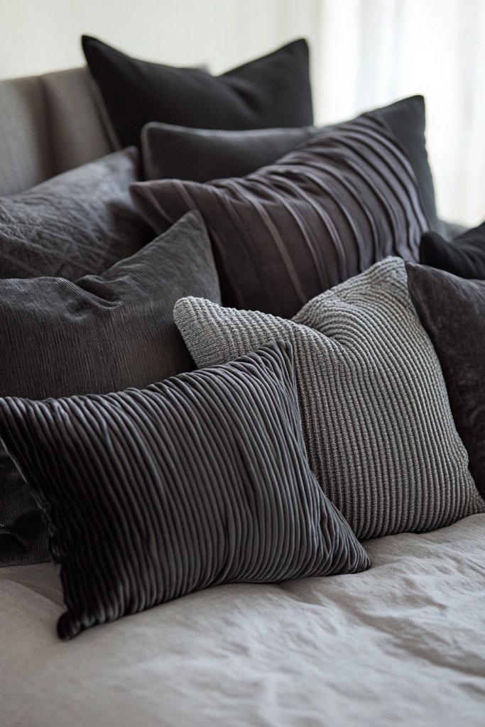 9. Charcoal-Themed Throw Pillows with Varied Textures