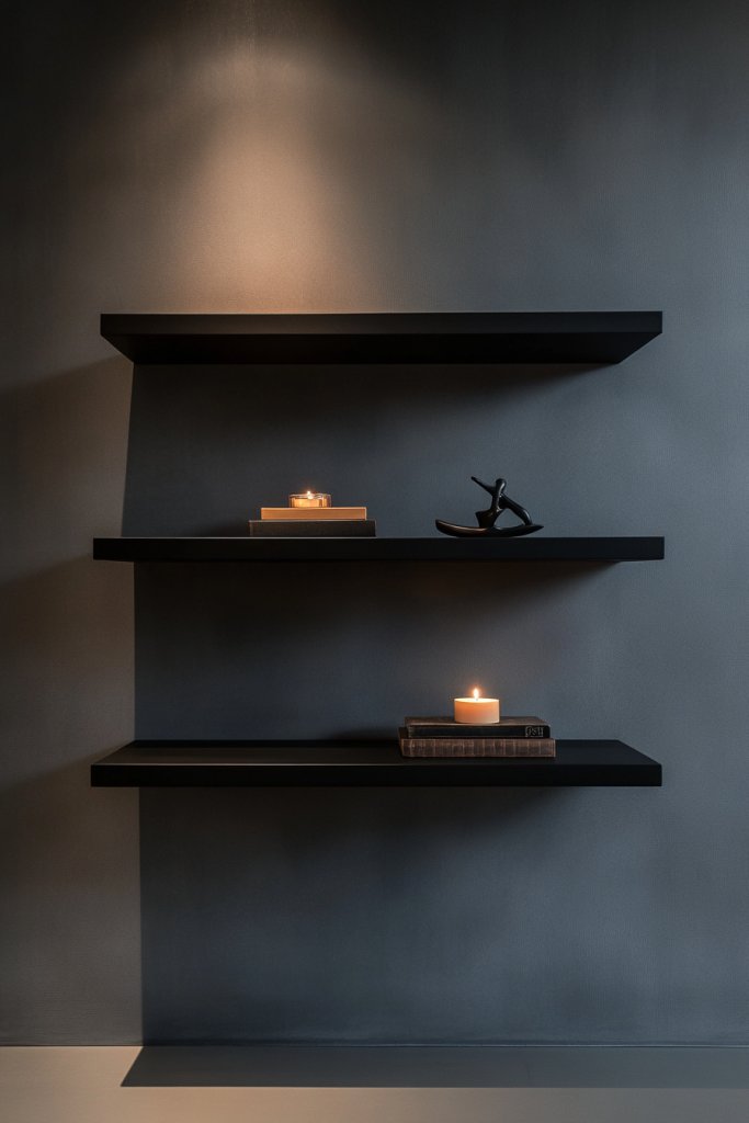 Imagine minimalist black metal shelves mounted on a dark wall, holding a curated collection of books, ceramics, or decorative sculptures—all in dark or metallic tones. The matte finish absorbs light, keeping the look understated yet impactful. When styled correctly, the shelves add depth and dimension to your room, transforming storage into a design feature. They break up large wall spaces and create a layered, organized vibe.