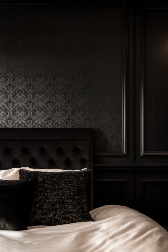 Imagine an accent wall covered in dark, matte wallpaper with a delicate pattern—like subtle stripes, damask, or textured geometrics. The matte surface absorbs light, reducing glare and emphasizing the pattern’s depth. It pairs beautifully with light bedding and minimalistic furniture, creating a layered, luxurious look. When lit softly, the wallpaper’s texture becomes a quiet statement piece that anchors your entire decor.