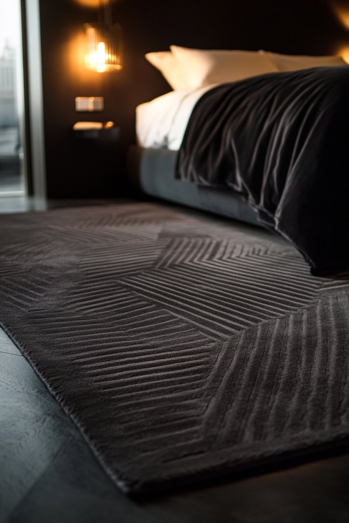 Imagine a plush, charcoal flatweave or shag rug with bold, contrasting geometric shapes like triangles or chevrons. The pattern adds a modern edge, breaking up large swaths of dark flooring. The soft texture underfoot invites you to sink in, making mornings more comfortable. When paired with lighter walls and bedding, the rug creates a striking visual anchor that grounds the entire room. It’s like a piece of art you can walk on.