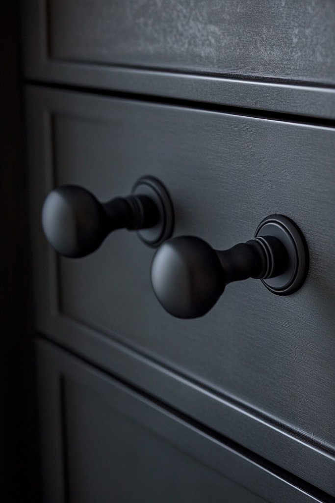 Visualize matte black drawer pulls, door handles, and light switch covers that blend seamlessly with dark walls and furniture. Their soft, velvety finish absorbs light rather than reflects it, creating a subtle, sophisticated vibe. When paired with dark wood or metal accents, these fixtures add depth without cluttering the space. They provide functional detail that’s both practical and stylish, quietly elevating the overall design.