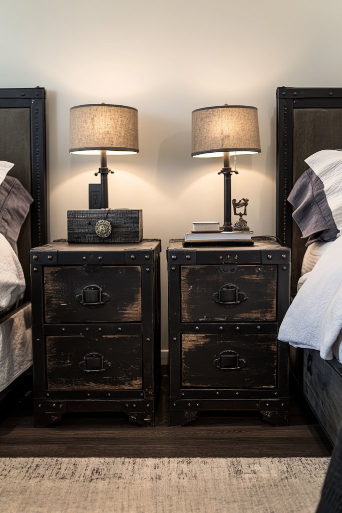 Imagine sleek, black metal nightstands with open shelving or concrete-like surfaces paired with your bed. The raw, matte finish adds texture and depth, contrasting beautifully with smooth bedding or a soft throw. Their simple geometric shapes keep the look modern, while the distressed details lend an authentic, vintage vibe. When placed on either side of a dark-paneled bed, they frame the space perfectly, anchoring your room’s style.
