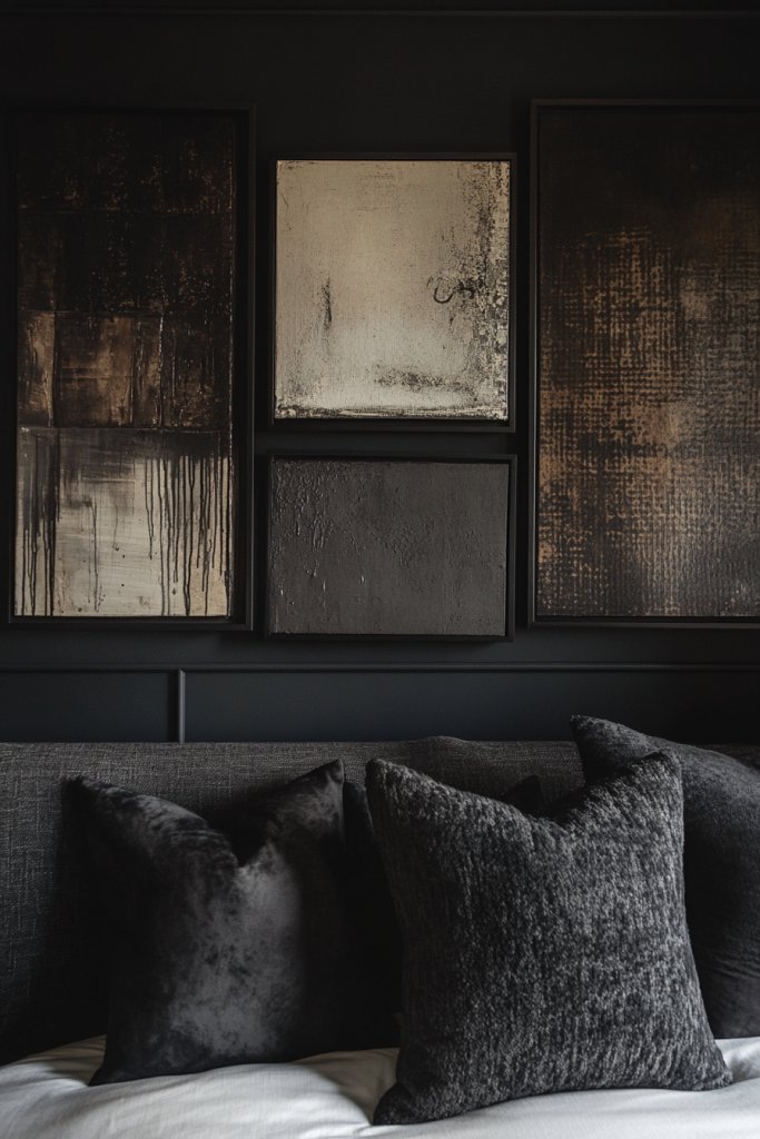 7. Moody Wall Art in Dark Tones and Subtle Textures