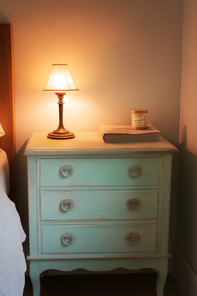 Imagine a chunky, vintage dresser painted in a bold, trendy color like deep teal or soft blush. The distressed finish adds a touch of shabby chic, while new hardware or knobs give it a modern twist. The surface is sleek but shows subtle signs of wear that tell a story. It stands proudly next to a cozy bed, with a plush throw blanket draped over the side, ready to hold your essentials. The contrast of old meets new makes it a statement piece.