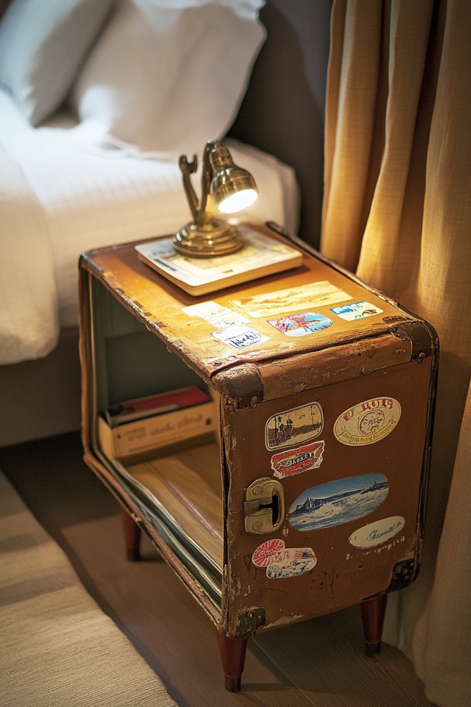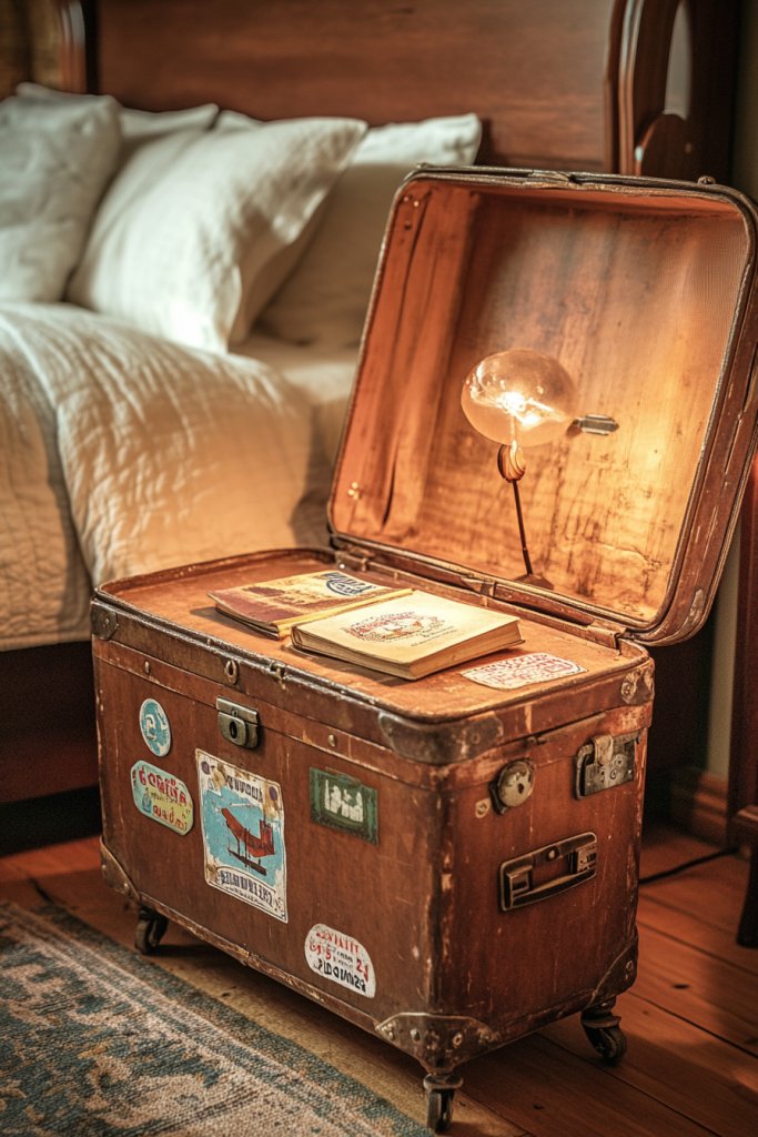 Imagine a vintage suitcase, cleaned and possibly painted in a bright color or distressed finish, sitting next to your bed. Its lid is propped open or removed to reveal storage inside, perfect for books, pajamas, or other small essentials. The suitcase is elevated on hairpin or wooden legs, giving it a modern twist. Decorated with vintage hardware or decorative straps, it exudes charm and character. The unexpected combination of retro and modern creates a unique focal point.