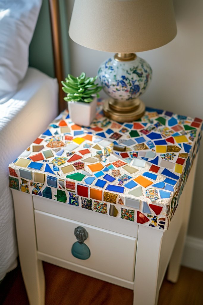 Looking to add a bold statement to your bedroom without buying new furniture? Or maybe you want a surface that’s both functional and artistic? A mosaic tile top can turn a plain nightstand into a vibrant, textured focal point. It’s a creative way to incorporate color and personality while keeping costs low. Who says furniture can’t be a piece of art?