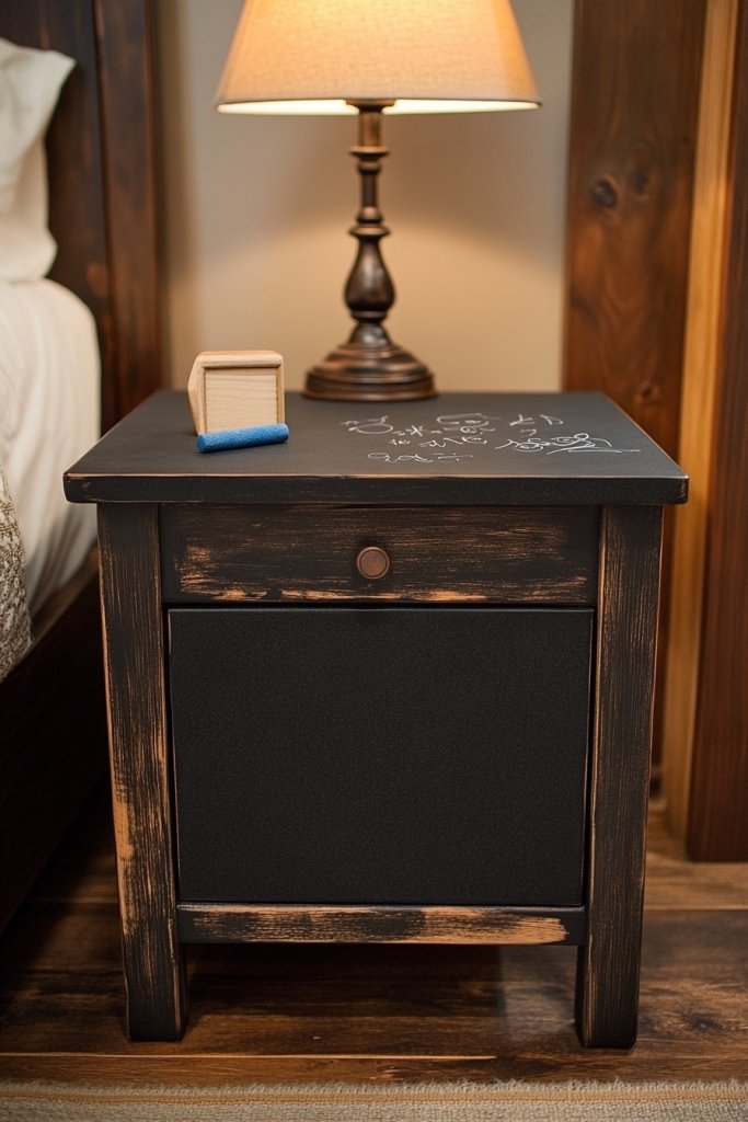 Picture a sleek nightstand with a matte black or chalky finish, ready to be written on. You can leave messages, draw doodles, or organize your thoughts right on the surface. The chalkboard area contrasts beautifully with metallic or wooden hardware, creating a modern yet personal touch. It invites interaction and adds a layer of functionality to your decor. It’s like having a giant notepad at your bedside.