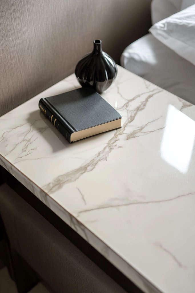 Imagine a bedside table transformed with a glossy, veined marble contact paper in shades of white, gray, or black. The pattern mimics real marble, complete with intricate veins and natural variations. The contact paper’s smooth finish gives a sleek, polished look, making the furniture appear more expensive. It’s a simple update that adds sophistication and a touch of elegance to your space.