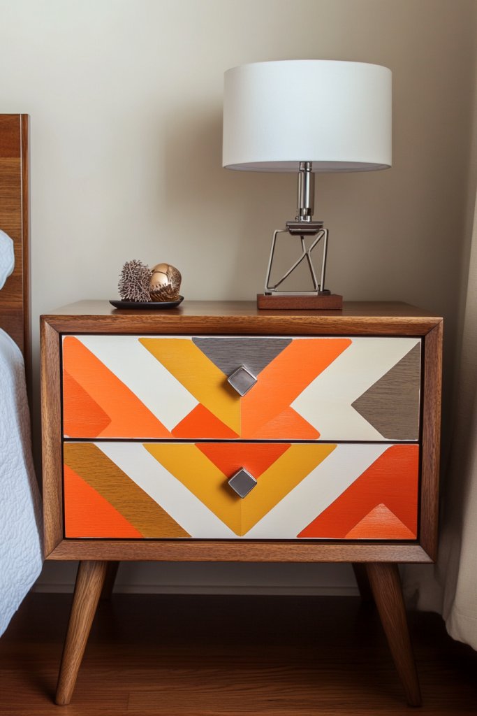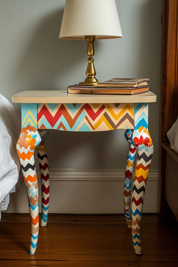 Imagine a sleek nightstand with its legs painted in bold stripes, polka dots, or chevrons in contrasting colors. The top remains a neutral or matching solid hue, grounding the piece. The patterned legs draw the eye downward, adding a touch of personality and movement. It’s a playful yet sophisticated look that balances fun with elegance. Paired with minimalist decor, it creates a fresh, contemporary vibe.