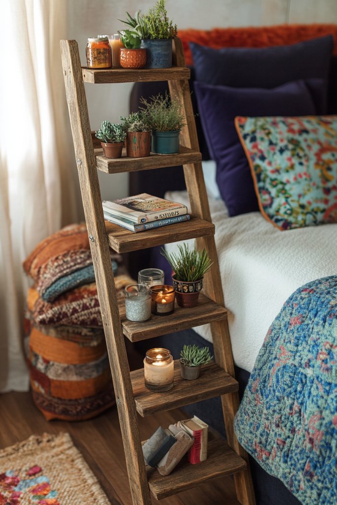 Picture an old wooden ladder, sanded and painted in a fresh hue, leaning against your wall. Flat surfaces or attached planks serve as shelves or platforms for your essentials. Decorated with textiles, books, or small plants, it creates a layered, textured look. The open rungs provide space for hanging items or accessories. It’s a functional art piece that adds height and visual interest to your bedroom.
