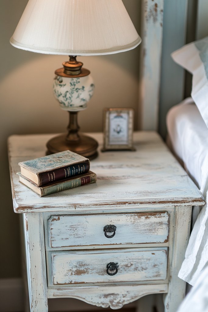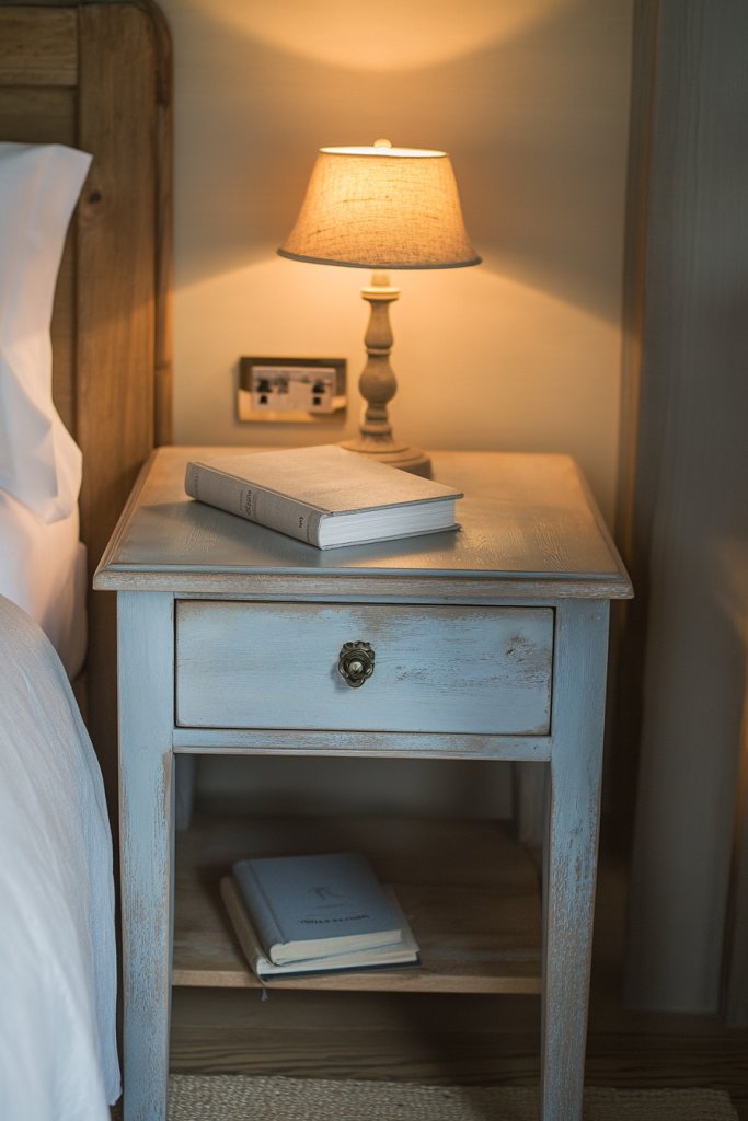 Visualize a little bedside table with a soft, matte finish in a muted pastel or off-white shade. The paint’s chalky texture gives it an aged appearance, with subtle cracks and chips that add authenticity. You might distress the edges with sandpaper to reveal glimpses of the wood underneath. The overall effect is cozy, inviting, and full of nostalgic charm. It pairs well with vintage textiles and soft lighting.