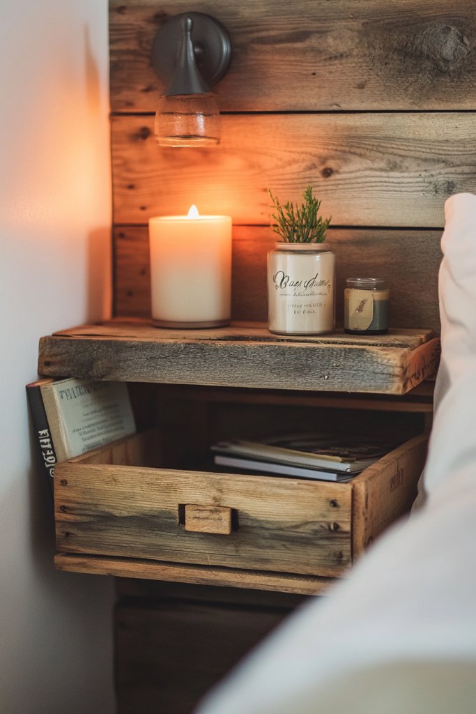 Picture a sturdy wooden pallet mounted on the wall with a clean, painted finish. Attached underneath is a small drawer or box, perfect for storing bedside essentials. The shelf holds books, a clock, or decorative items, while the drawer keeps clutter out of sight. The combination of open and hidden storage creates a balanced, inviting look. It’s a practical piece that also adds texture and warmth to your decor.