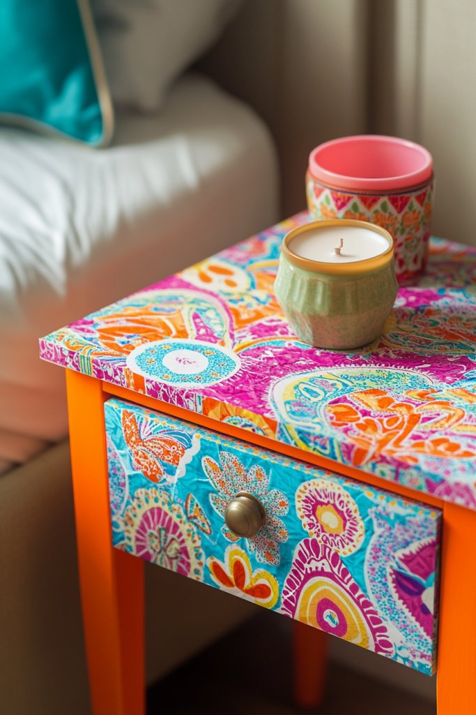 Imagine a plain wooden nightstand transformed with vibrant, patterned tissue paper. The paper features bold florals, geometric shapes, or abstract designs, layered carefully over the surface. The edges are sealed with a glossy finish, adding a subtle sheen that makes the colors pop. The texture is smooth to the touch, yet visually dynamic. It sits next to your bed, radiating personality and charm, like a little piece of art.