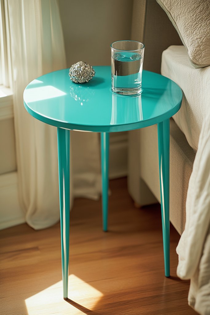 Picture a sleek metal table painted in a vivid coral or electric blue. The glossy finish makes it catch the light, adding a pop of color to your room. The smooth surface is free of rust or chips, thanks to a fresh coat of spray paint. It sits confidently beside your bed, with a soft throw or a stack of books on top, ready to serve as both a functional and decorative element. The contrast between shiny metal and colorful paint adds modern flair.