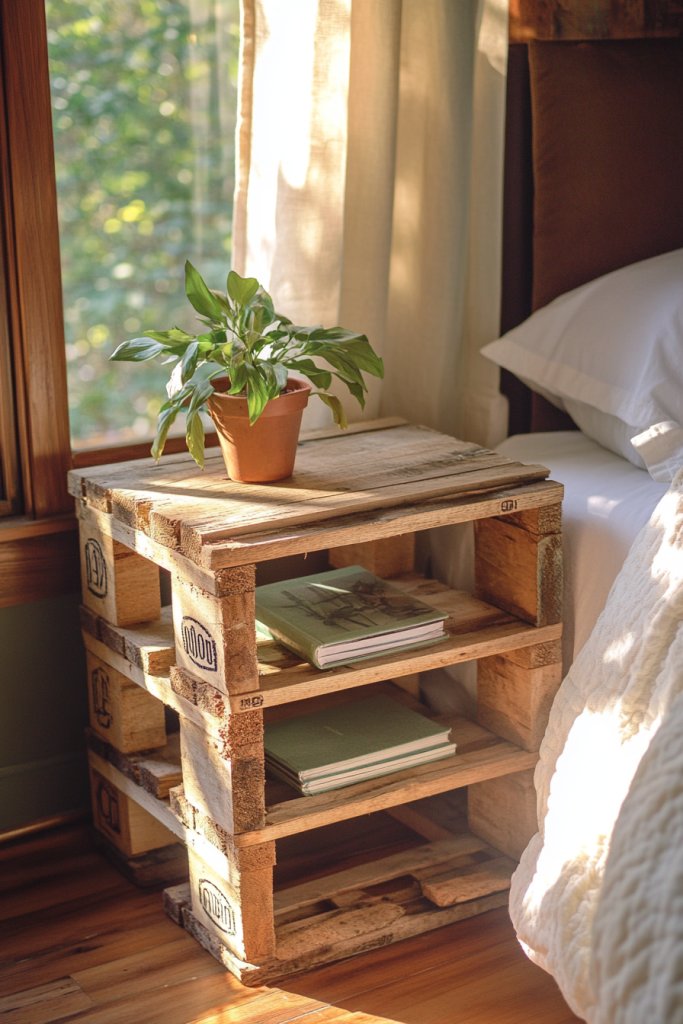 Visualize a simple pallet with its slats sanded smooth and stained in a warm honey or dark walnut tone. The natural imperfections and weathered look lend authenticity and charm. It’s topped with a reclaimed wood board for a flat surface, perfect for holding a lamp, books, or a glass of water. The open slats underneath provide space for storage or decorative baskets. The overall effect is cozy, inviting, and full of rustic appeal.