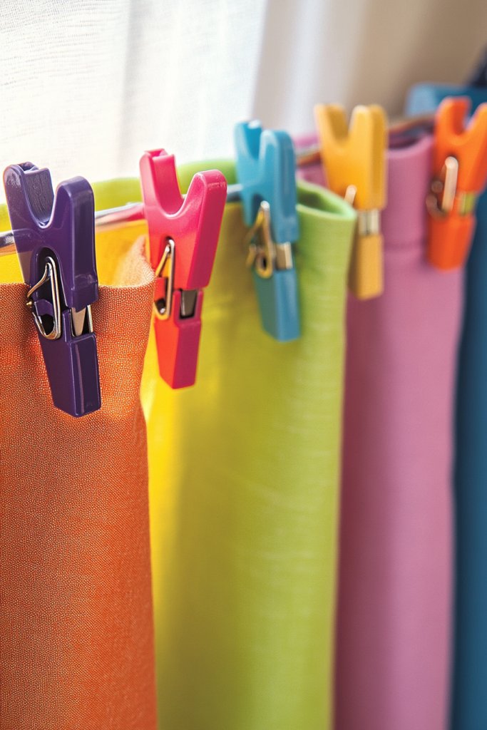 Customize your clips with paint, fabric wrapping, or embellishments like beads or charms. Use different clip styles to create a layered, eclectic vibe. You can also attach decorative trims or ribbons to the clips for added flair. This method makes it easy to switch up styles without new curtains, giving your decor versatility.