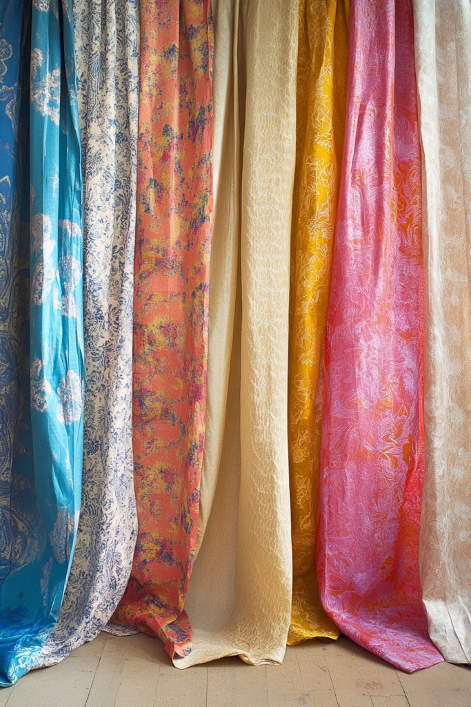 Picture a vibrant paisley scarf casually draped over a simple curtain rod, spilling down in flowing folds. The combination of different fabrics and patterns creates a layered, eclectic look that’s both stylish and cozy. When sunlight filters through the fabric, it produces a colorful, dappled effect that brightens the room. It’s like a piece of wearable art framing your window.