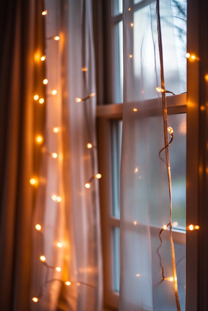 Imagine delicate fairy lights draped along your curtain rod, casting a gentle, flickering light that makes your room feel intimate. Behind a semi-sheer curtain, the lights create a shimmering backdrop that softens the entire window area. When turned on at night, they add a magical, almost fairy-tale vibe, perfect for relaxing evenings or romantic dinners.