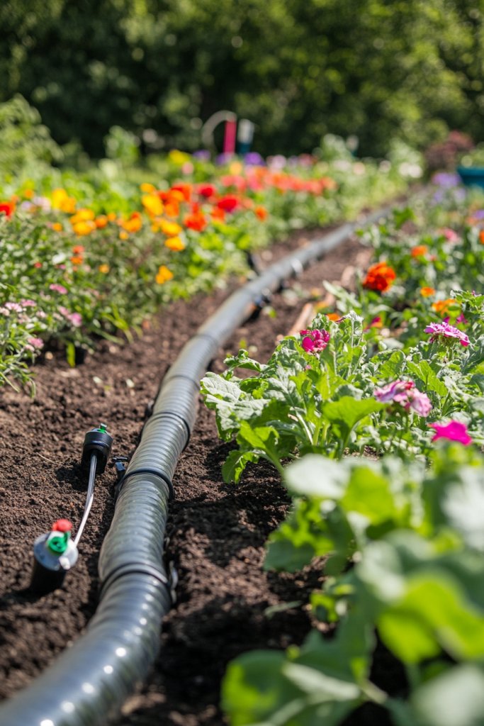 Imagine a neat network of thin tubing snaking through your garden beds, delivering water directly to roots. Each plant gets just the right amount, minimizing waste. The system quietly hums in the background, ensuring your plants stay healthy. It’s a low-profile, tidy setup that blends seamlessly with your landscape.