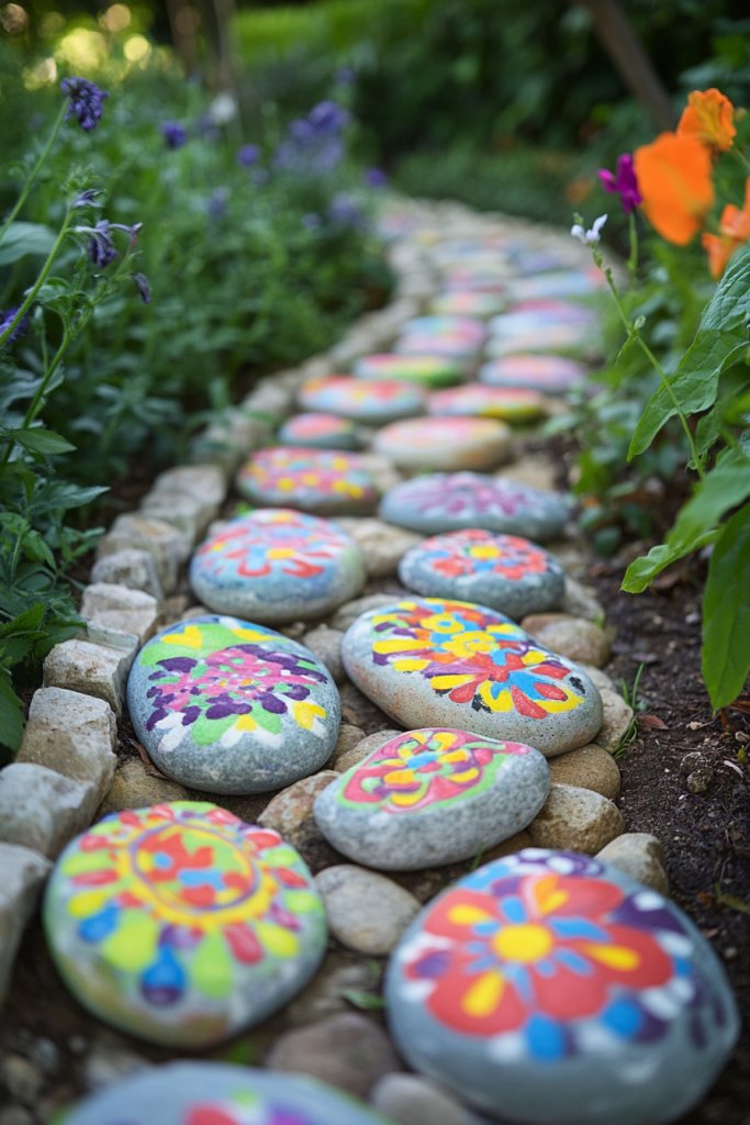 Visualize a winding garden path lined with smooth, painted stones in bright colors or intricate patterns. Each rock serves as a visual cue—indicating plant zones or directions. The stones add texture and color, creating a playful, inviting environment. Some are decorated with symbols or quotes that reflect your personality.