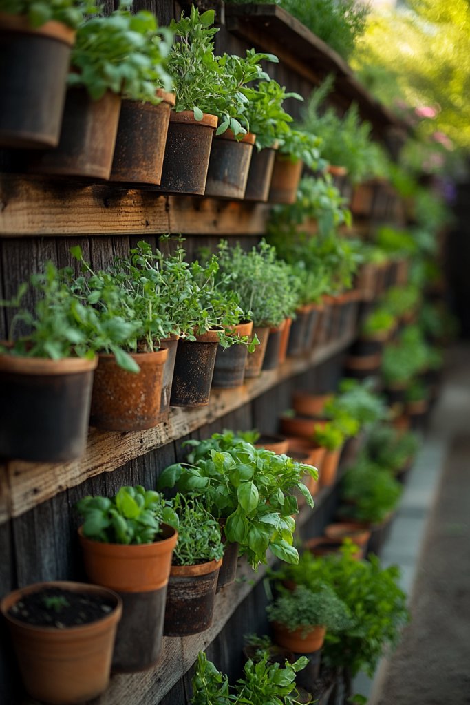 Picture a vertical wall of wooden pallets filled with vibrant greens—basil, lettuce, cherry tomatoes—bursting with life. The rustic wood adds charm, and the compact design makes it perfect for small yards or patios. The pallets stand upright or lay flat, creating a layered, textured garden. Morning dew glistens on fresh leaves, and the scent of herbs fills the air.