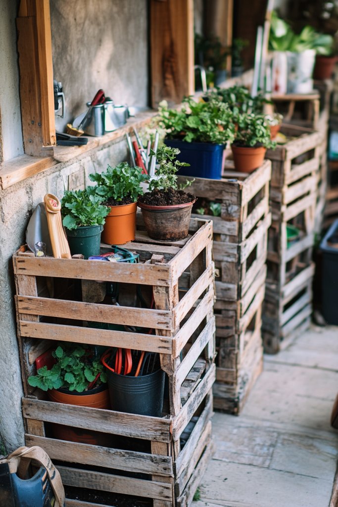 17. Use Reclaimed Wooden Crates as Storage or Plant Stands