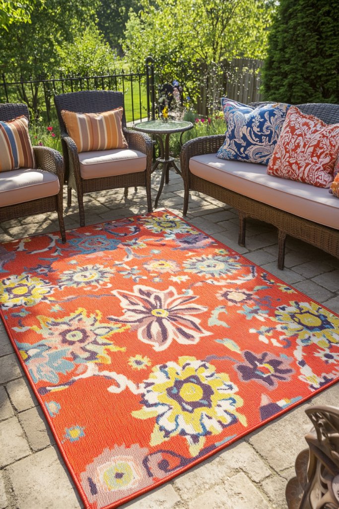 Envision a vibrant, patterned rug laid beneath a weather-resistant table and chairs. The bright colors contrast with neutral paving stones or decking, energizing the space. Textured mats add tactile appeal and soften hard surfaces. When the sun sets, string lights or lanterns cast a warm glow, making your outdoor area feel warm and welcoming.