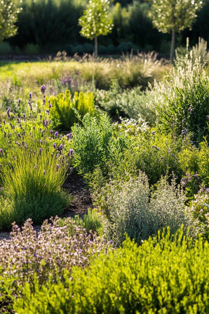 Imagine a garden bed filled with drought-tolerant wildflowers and grasses, naturally thriving without fuss. The plants’ varied textures and shades of green create a relaxed, natural look. Birds, bees, and butterflies flutter around, adding lively movement and sound. It’s a vibrant, eco-friendly landscape that blends seamlessly into the environment.
