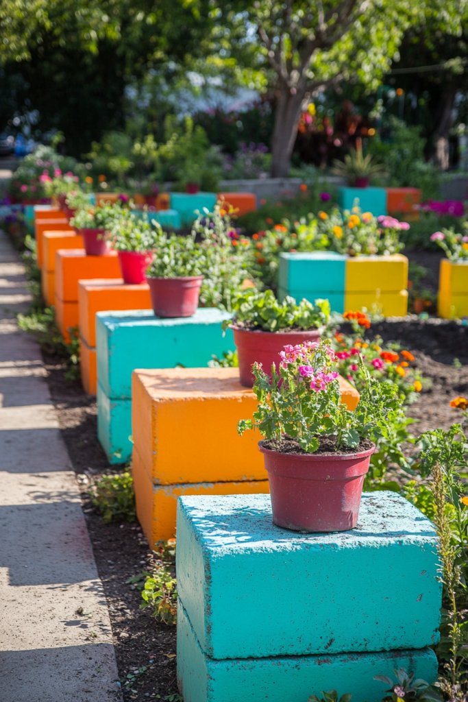 Imagine bright, bold cinder blocks arranged neatly along a garden bed, each topped with potted plants or used as a low wall. The vibrant colors pop against lush green foliage, creating a playful yet organized look. Some blocks serve as stepping stones, while others act as stands for herbs or flowers. The textured surface adds an industrial-chic vibe.