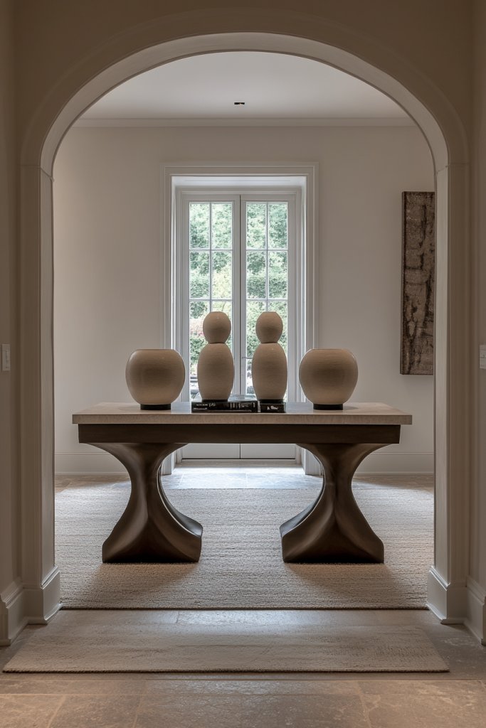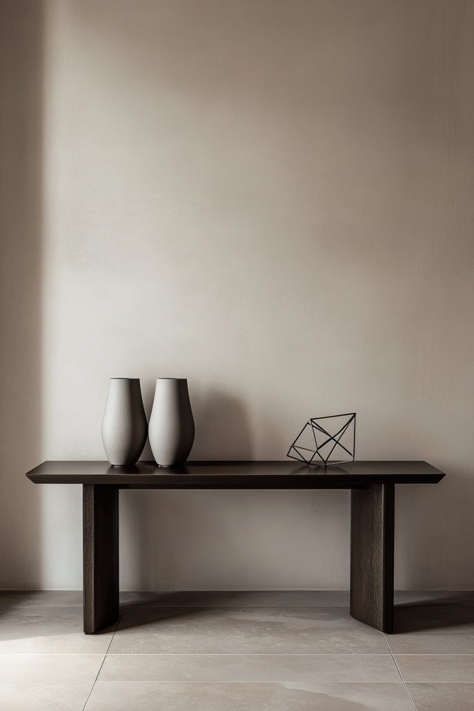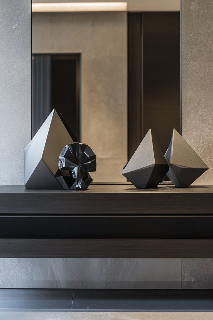 If you want a space that feels current and expressive, this idea is your go-to. Picture a console with a set of angular, sculptural decor pieces—like geometric vases, sculptures, or wall art (avoiding wall art if you prefer minimalism).