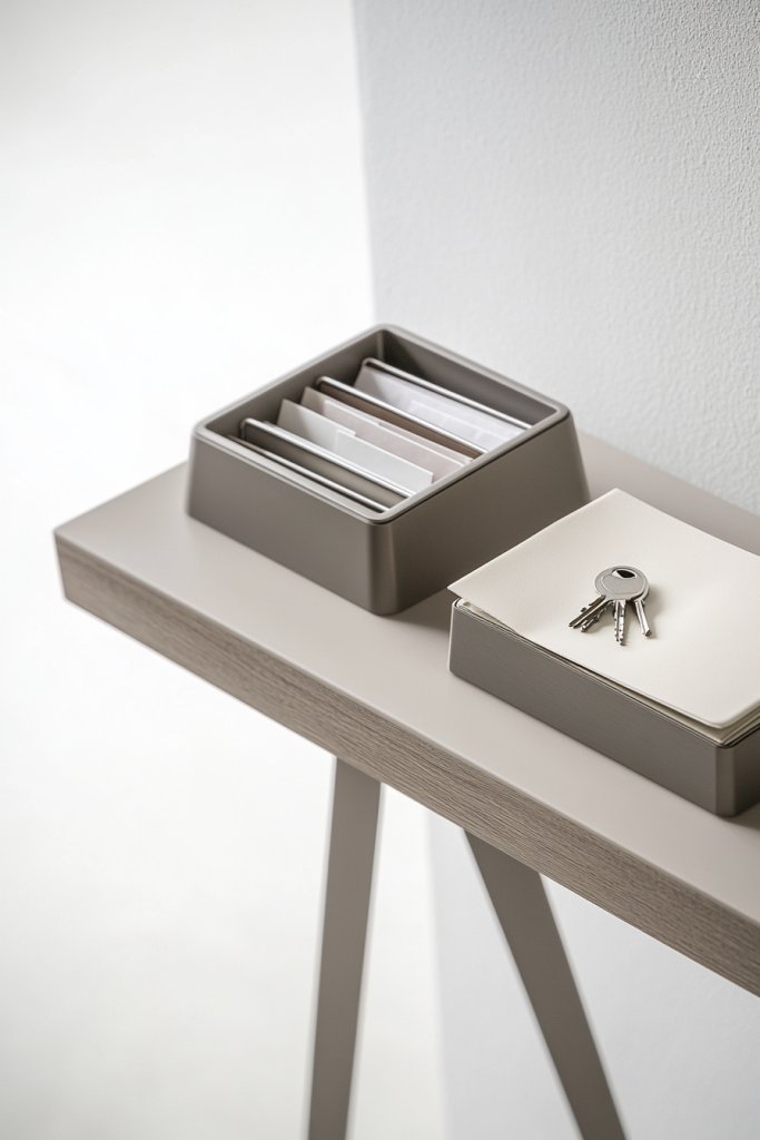 If you want your space to feel polished and refined, this idea offers an effortless upgrade. Picture a sleek console topped with a gold-trimmed tray holding small decorative objects, like a textured box or a sculptural piece.