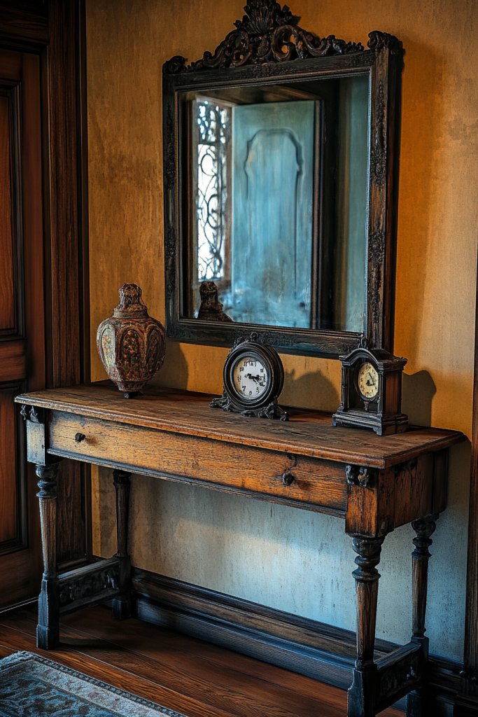 An old, ornate mirror with a weathered frame hangs above, reflecting the history of your home. Small vintage accessories—like a retro clock or a classic ceramic jar—complete the look.