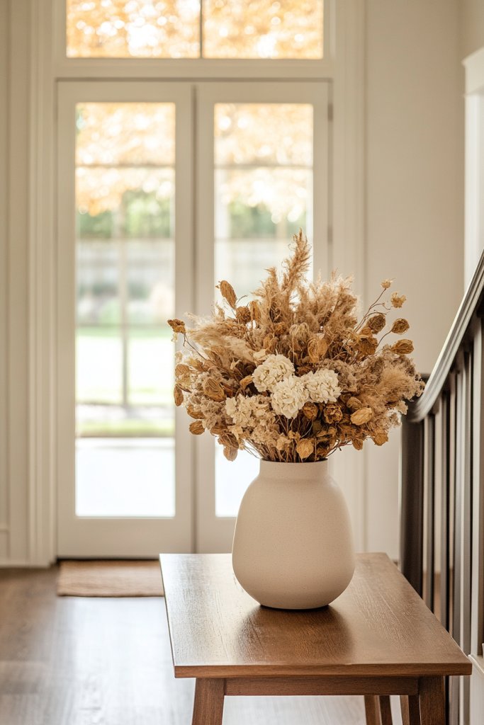 Hate the hassle of caring for real plants but love the look of greenery? Faux or dried arrangements offer a fuss-free way to add natural beauty to your entryway. They bring texture and life without the ongoing maintenance.