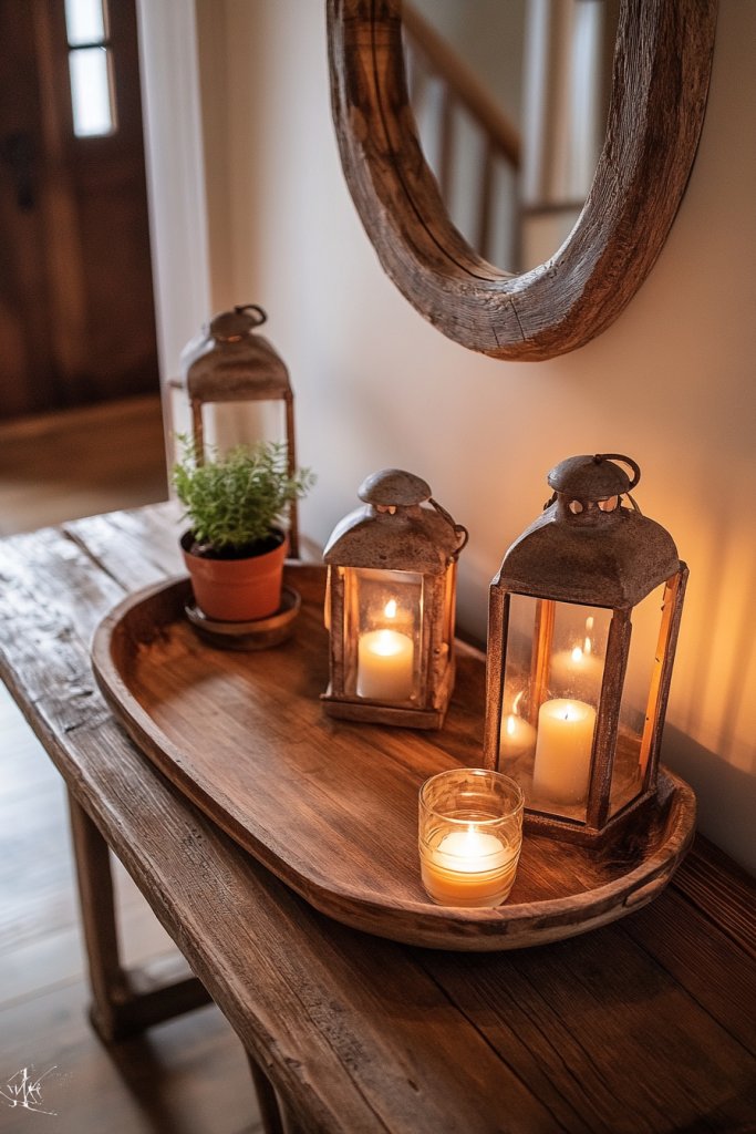 Feeling like your entryway lacks warmth and personality? Rustic charm can turn a plain space into a cozy retreat. Wooden trays and lanterns evoke a farmhouse vibe that’s both inviting and timeless.
