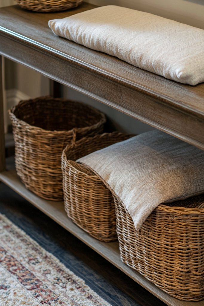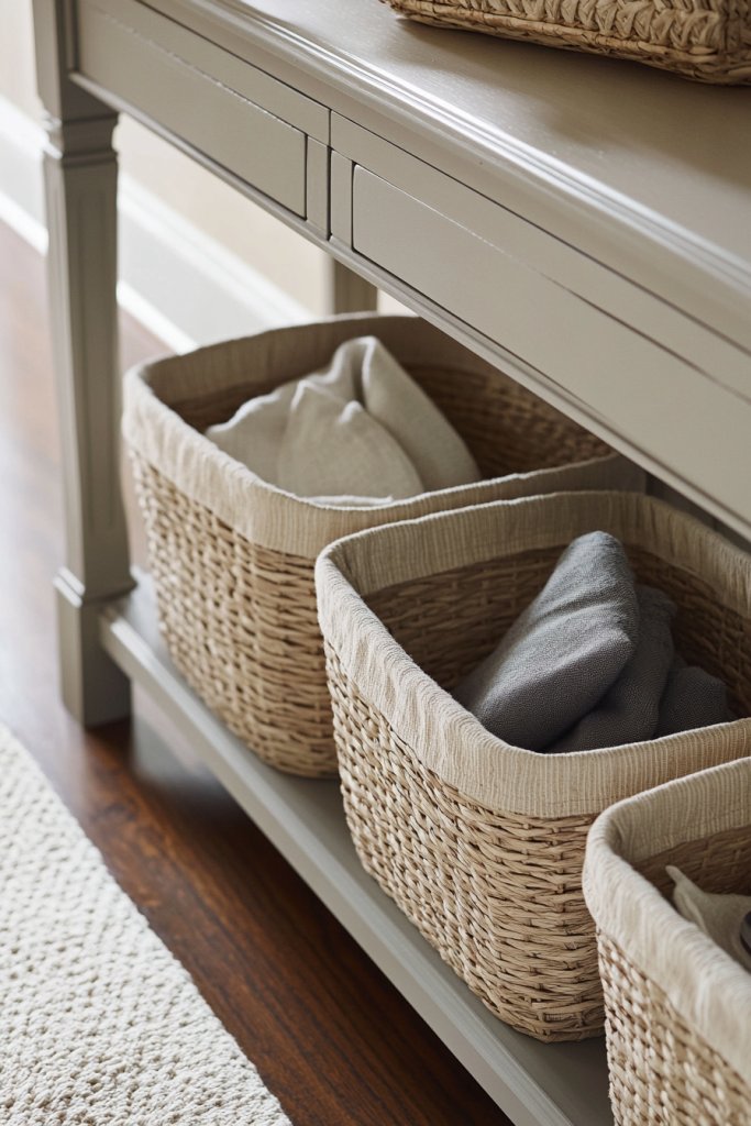 If you want an organized, clutter-free entrance that still looks great, this idea is key. Imagine a row of woven baskets in natural tones lining the bottom of your console, holding shoes, umbrellas, or scarves.