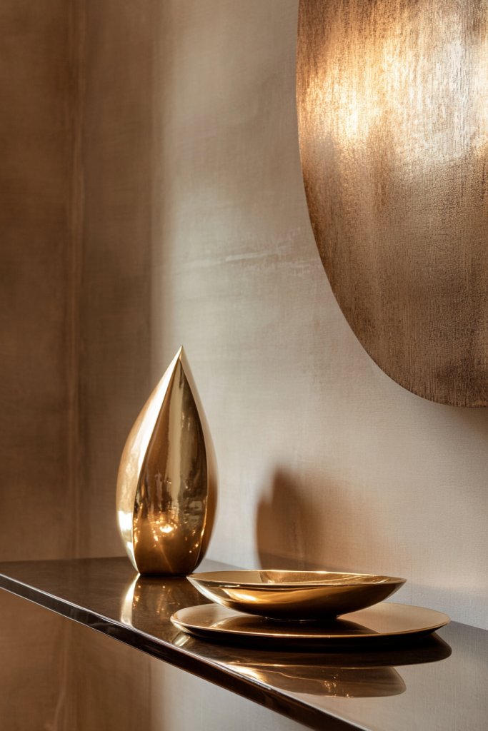 Layer metallic accents with neutral or matte textures for a sophisticated look. Remove excess items to maintain a sleek aesthetic.