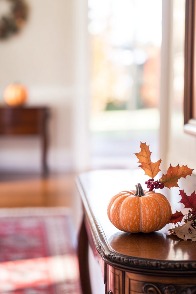 Incorporate seasonal elements like mini pumpkins, pinecones, or flowers to keep the vignette fresh all year round. Mix small objects of varying textures and materials—ceramic, wood, or fabric—to add visual interest.