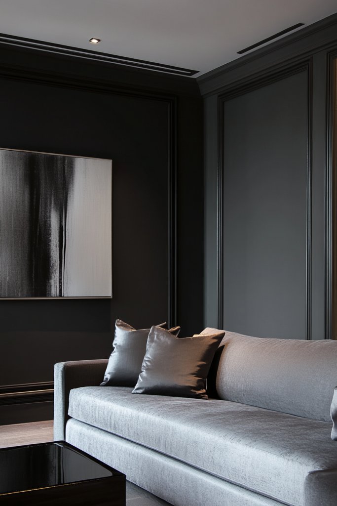 Imagine a lounge bathed in deep, smoky gray walls that absorb yet reflect ambient light beautifully. Soft textures like velvet cushions and plush throws add richness without competing with the paint. The room feels cozy yet stylish, with subtle contrasts created by metallic accents and dark wood furniture. It’s a space that whispers elegance and comfort simultaneously.