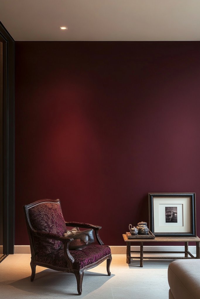 Visualize a wall painted in rich burgundy, paired with elegant furniture and subtle metallic accents. Soft lighting enhances the warmth of the color, casting a cozy glow. Layered textiles like velvet cushions or silk drapes add to the luxurious feel. The overall ambiance is sophisticated, inviting, and perfect for creating a dramatic yet refined atmosphere.